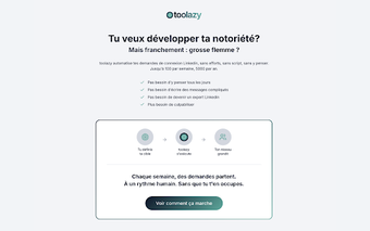 L'utilisation de Toolazy est idéale pour les freelances, consultants et indépendants qui souhaitent accroître leur visibilité sans y consacrer trop de temps ou d'efforts. L'outil fonctionne de manière autonome, permettant aux utilisateurs de se concentrer sur d'autres tâches importantes. En éliminant le stress lié à la prospection, Toolazy facilite la construction d'une marque personnelle solide et durable sur LinkedIn.